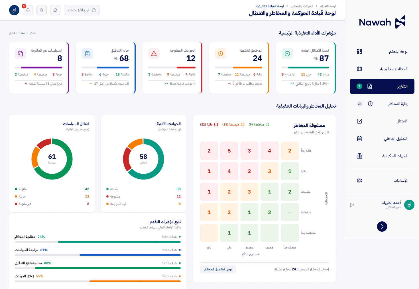 إطار رقمي متكامل لإدارة الحوكمة والمخاطر والامتثال، يضمن الشفافية، قابلية التتبع، وجاهزية التدقيق وفق أعلى معايير التنظيم المؤسسي.